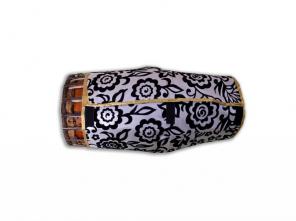 This Mridangam has a deep metallic timbre and powerful frequency bass sounds. The instrment is tuned by tightening the straps on the sides. The Gajras are lowered for playing comfort. The instrument is available in two different tones, G and D. Thereby changing the sizes of the instrument by a few inches.